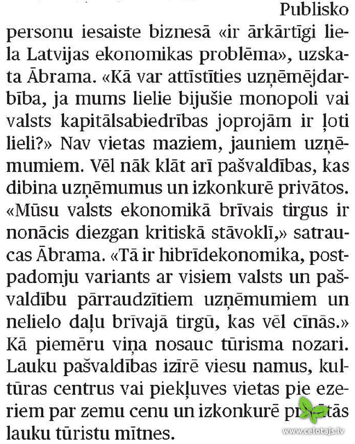 Nobeidzot vēstuli, gribu citēt S.Ābramas k-dzes, bijušās Konkurences padomes vadītājas teikto, pirms viņai bija jāpamet sava darba vieta, un ar kuru kopā iesākām nežēlīgu cīņu par Latvijas brīvā tirgus ceļu (citāts publicēts 16-22.01.2020 žurnālā „Ir”) arī tūrisma jomā: