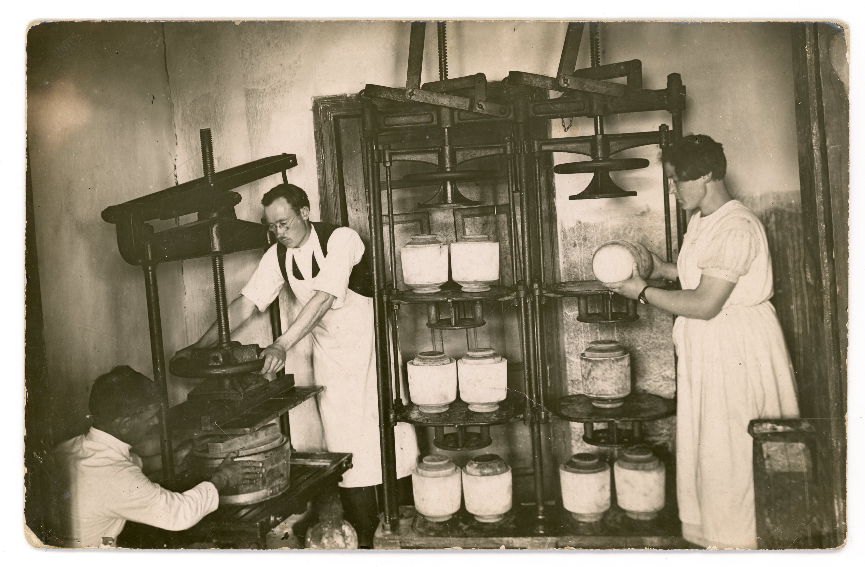 Процесс производства сыра на молочной ферме, предположительно, в Друвиенасе, 1930-е годы.